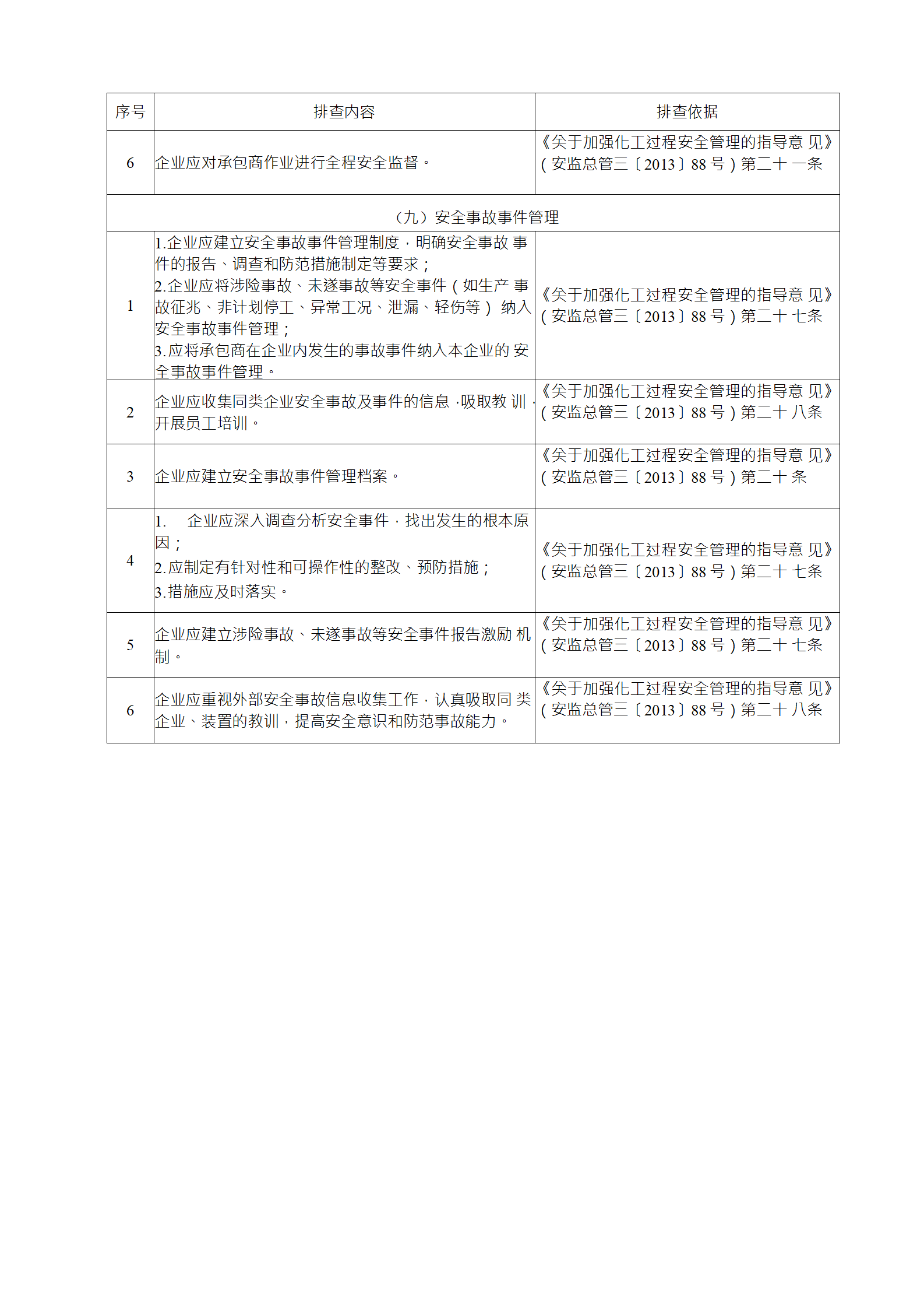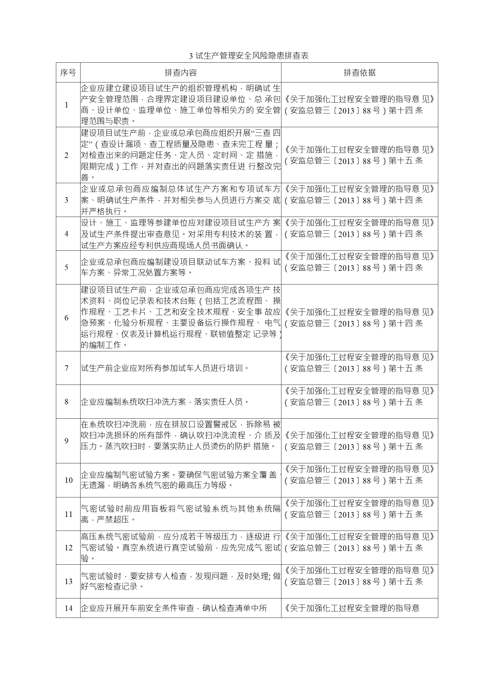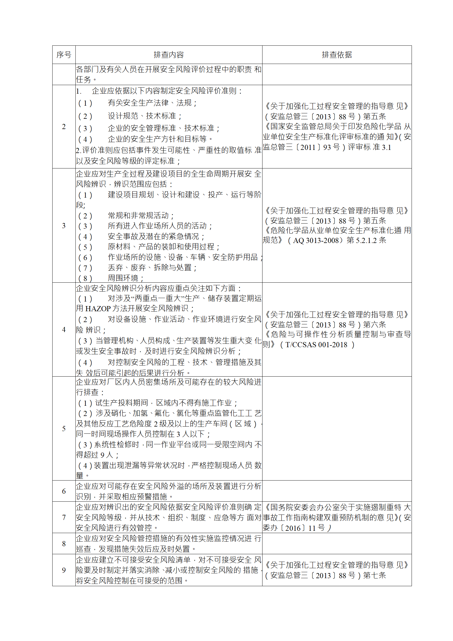 企業(yè)應結合自身安全風險及管控水平,按照化工過程安全 管理的要求,參照各專業(yè)安全風險隱患排查表(見附件),編制 符合自身實際的安全風險隱患排查表,開展安全風險隱患排查 工作。