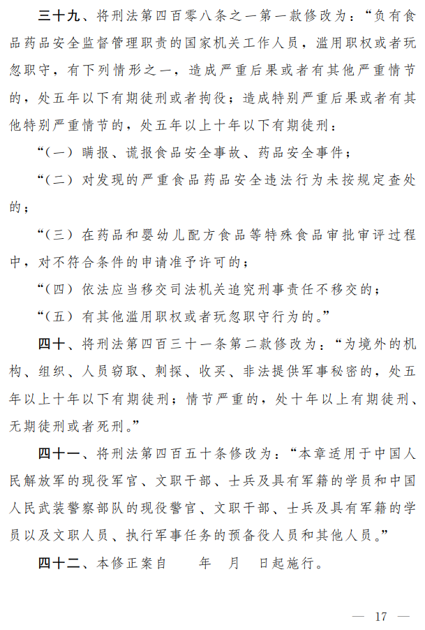 從二次審議稿內容來看, 關于食品藥品監(jiān)管瀆職罪的規(guī)定與今年7月份的發(fā)布的草案相比 ,有了重大變化,取消了“未及時發(fā)現(xiàn)監(jiān)督管理區(qū)域內重大食品藥品安全隱患的“的規(guī)定。草案內容具體如下: