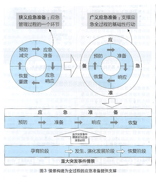 (一)全過(guò)程、多角度的情景分析。經(jīng)典的應(yīng)急管理理論,將應(yīng)急管理過(guò)程劃分為四個(gè)階段:預(yù)防、準(zhǔn)備、響應(yīng)和恢復(fù)。近十年應(yīng)急管理學(xué)界逐步認(rèn)識(shí)到應(yīng)急準(zhǔn)備的重要性,將其從單純一個(gè)過(guò)程環(huán)節(jié)提升為“支撐應(yīng)急全過(guò)程”的基礎(chǔ)性行動(dòng),進(jìn)而有了“廣義應(yīng)急準(zhǔn)備”和“狹義應(yīng)急準(zhǔn)備”兩個(gè)不同的概念,如圖3所示。