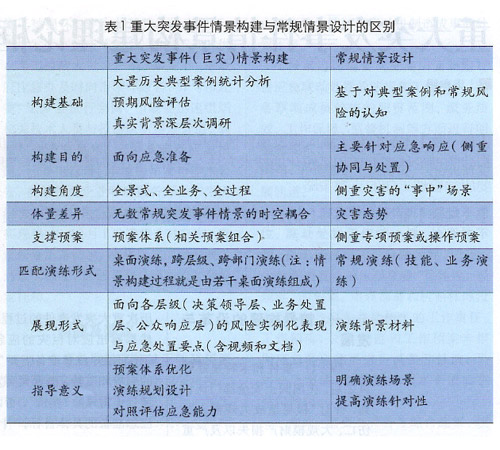 在傳統(tǒng)應(yīng)急管理中,實(shí)戰(zhàn)演練之前往往開(kāi)展情景設(shè)計(jì),常規(guī)情景設(shè)計(jì)與重大突發(fā)事件情景構(gòu)建無(wú)論在研究體量、研究目的,還是研究意義都存在著一定的差異,如表1所示。