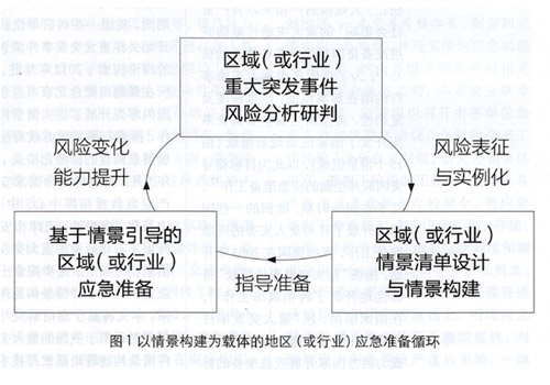 情景構(gòu)建是一個(gè)地區(qū)(或行業(yè))的戰(zhàn)略風(fēng)險(xiǎn)管理工具,在地區(qū)(或行業(yè))的重大突發(fā)事件風(fēng)險(xiǎn)研判基礎(chǔ)上,可以確定地區(qū)(或行業(yè))情景清單并且對(duì)每項(xiàng)典型風(fēng)險(xiǎn)開(kāi)展情景構(gòu)建,對(duì)典型風(fēng)險(xiǎn)進(jìn)行實(shí)例化表征;在情景構(gòu)建結(jié)束后,一系列情景可以引導(dǎo)地區(qū)(或行業(yè))有的放矢開(kāi)展應(yīng)急準(zhǔn)備行動(dòng),指導(dǎo)應(yīng)急能力的提升;伴隨著風(fēng)險(xiǎn)環(huán)境的變化、應(yīng)急能力的提高,在風(fēng)險(xiǎn)研判基礎(chǔ)上,可以將情景清單進(jìn)行動(dòng)態(tài)調(diào)整、或者對(duì)某項(xiàng)(不符合當(dāng)下風(fēng)險(xiǎn)的)情景進(jìn)行修訂。如此,可以形成一個(gè)以“情景構(gòu)建”為載體的應(yīng)急準(zhǔn)備循環(huán),如圖1所示。