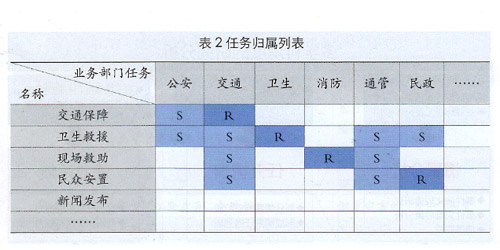 基于情景應(yīng)對(duì)的任務(wù)清單逐步清晰以后,可以通過(guò)業(yè)務(wù)部門(mén)的座談分析,明確各項(xiàng)任務(wù)的歸屬,得出表2所示的任務(wù)歸屬列表(R表示負(fù)責(zé)、S表示支持)。實(shí)踐表明,該項(xiàng)工作將會(huì)有效查漏補(bǔ)缺,優(yōu)化既有應(yīng)急機(jī)制,彌補(bǔ)體制上的條塊分割與碎片化問(wèn)題。