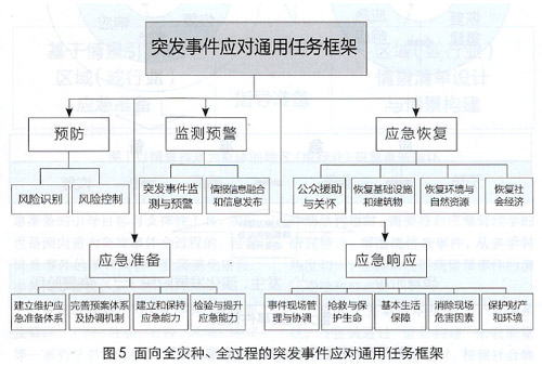 筆者所在課題組參考美國(guó)UTL的格式,對(duì)我國(guó)多災(zāi)種的應(yīng)對(duì)任務(wù)進(jìn)行了分析,提出了符合我國(guó)體制機(jī)制特點(diǎn)的突發(fā)事件應(yīng)對(duì)通用任務(wù)框架,該框架包含5類(lèi)任務(wù)領(lǐng)域、17類(lèi)一級(jí)任務(wù)、64類(lèi)二級(jí)任務(wù)(如圖5所示)。該任務(wù)框架是面向全災(zāi)種、全過(guò)程的任務(wù)框架,無(wú)論哪種類(lèi)型的突發(fā)事件情景,均可在該框架的引導(dǎo)下開(kāi)展任務(wù)梳理。