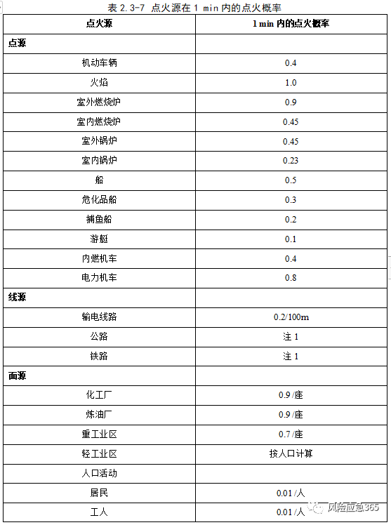 根據(jù)《危險化學(xué)品生產(chǎn)裝置和儲存設(shè)施外部安全防護距離確定方法》(GB/T 37243-2019),典型點火源分為:根據(jù)化工園區(qū)情況,點火源主要為人員靜電、違章動火、電氣設(shè)施、雷擊、機動車輛、使用工具(鐵質(zhì))不當產(chǎn)生火花以及外來火源等。根據(jù)《化工企業(yè)定量風(fēng)險評價導(dǎo)則》(AQ/T 3046-2013)附錄G,立即點火概率與裝置類型、物質(zhì)種類及泄漏(釋放)有關(guān),固定裝置可燃物質(zhì)泄漏后,立即點火概率見下表。延遲點火的點火概率應(yīng)考慮點火源特性、泄漏組分以及點火源處于蒸氣云團內(nèi)的概率,不同點火源在1min內(nèi)的點火概率見下表。