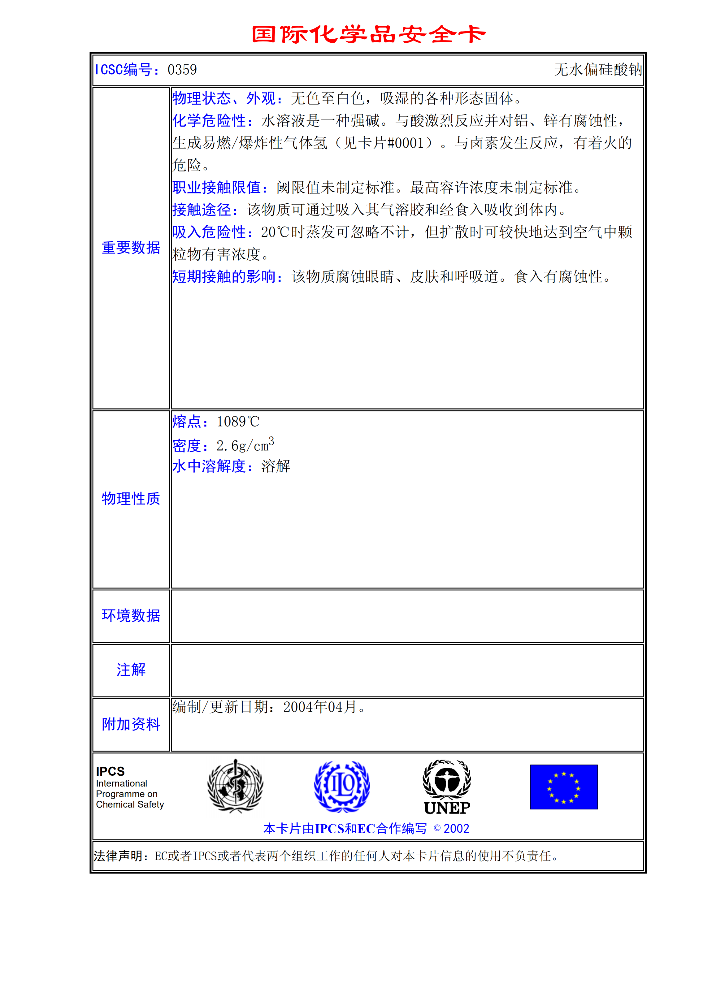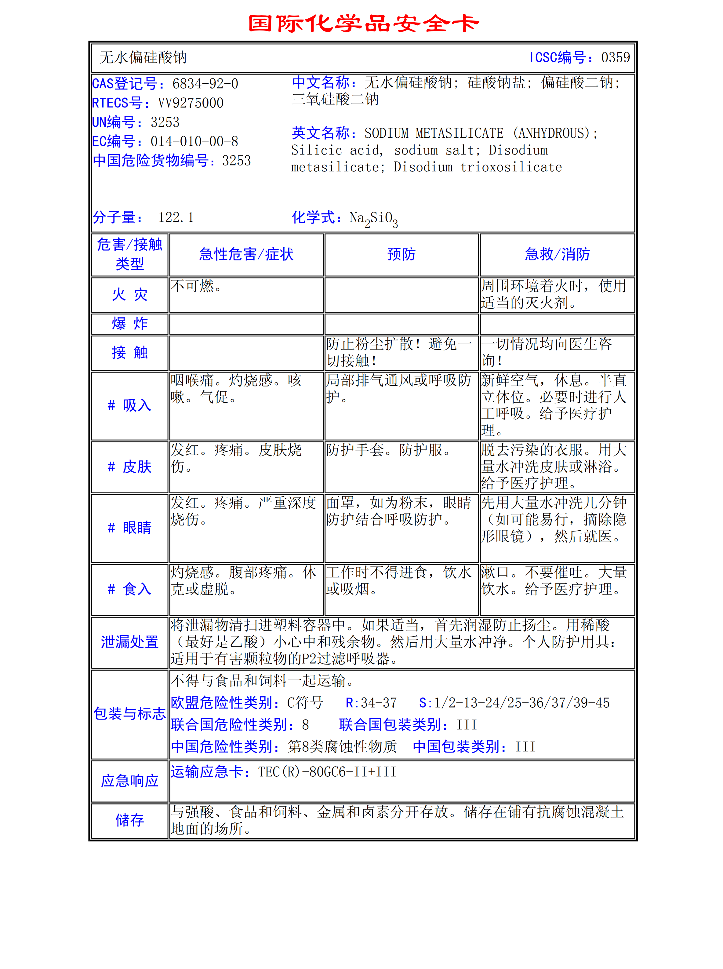 無(wú)水偏硅酸鈉MSDS