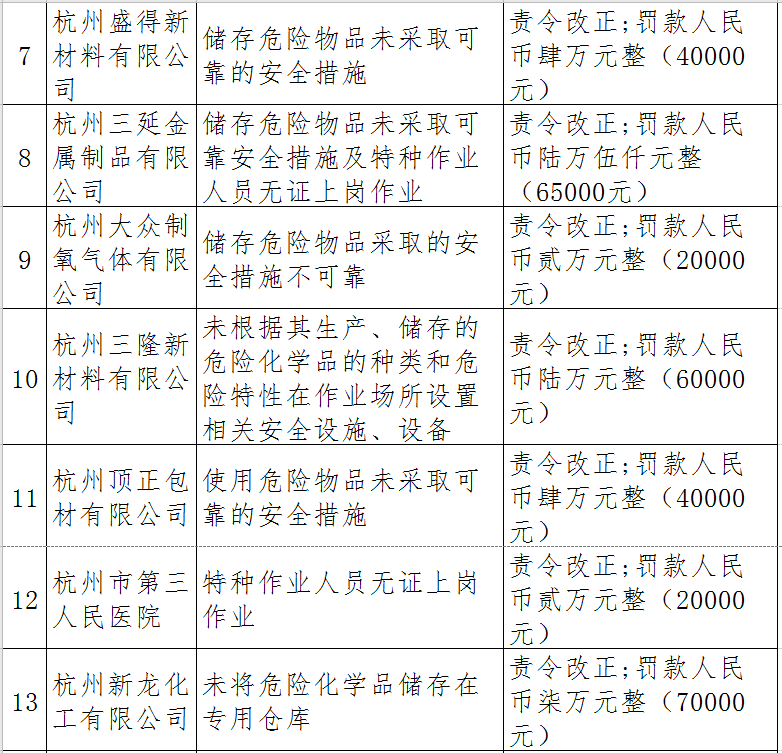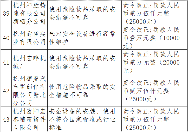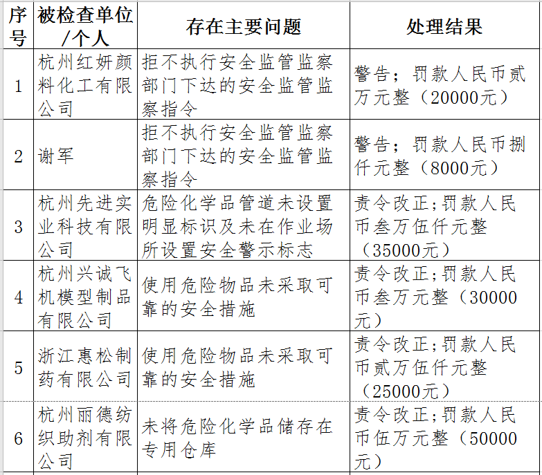 據(jù)了解,今年上半年,杭州市應(yīng)急管理局一手抓駐企復(fù)工復(fù)產(chǎn)、一手抓安全生產(chǎn),已完成年度執(zhí)法計(jì)劃、專項(xiàng)檢查、聯(lián)合執(zhí)法、信訪舉報(bào)核查等,并對檢查中發(fā)現(xiàn)的安全生產(chǎn)違法違規(guī)企業(yè)(個(gè)人)進(jìn)行了處罰?,F(xiàn)對52家被行政處罰的企業(yè)(個(gè)人)進(jìn)行曝光,希望各企業(yè)引以為戒!
