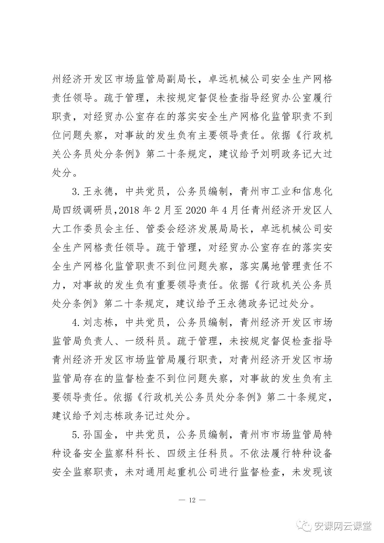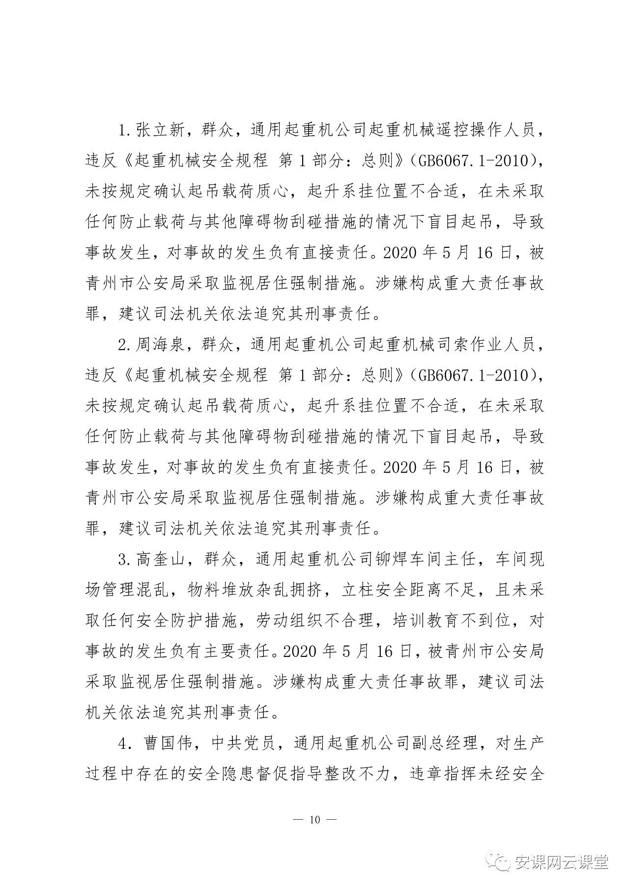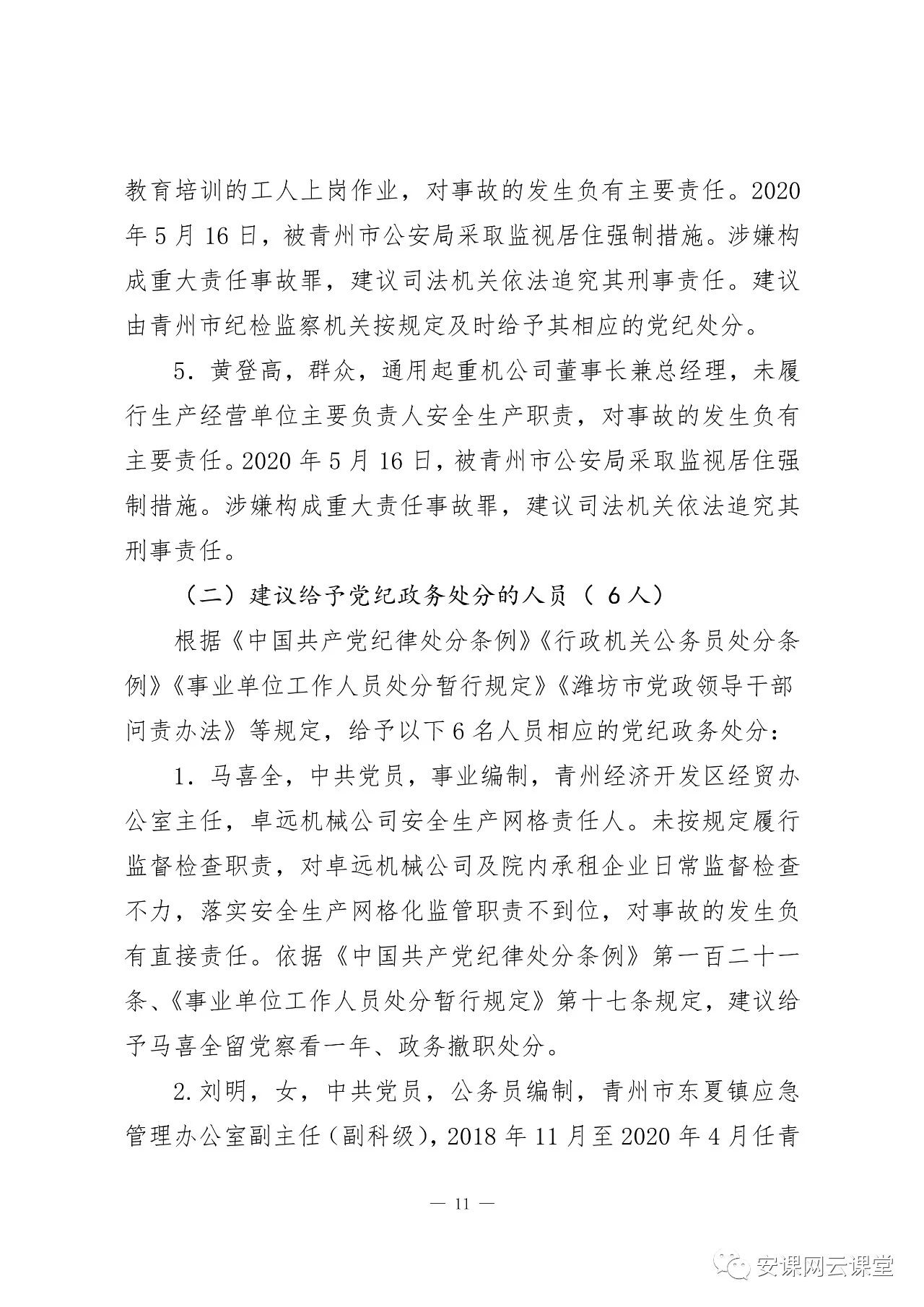 2020年5 月16 日,被青州市公安局采取監(jiān)視居住強制措施。涉嫌構(gòu)成重大責(zé)任事故罪,建議司法機關(guān)依法追究其刑事責(zé)任。建議由青州市紀(jì)檢監(jiān)察機關(guān)按規(guī)定及時給予其相應(yīng)的黨紀(jì)處分。