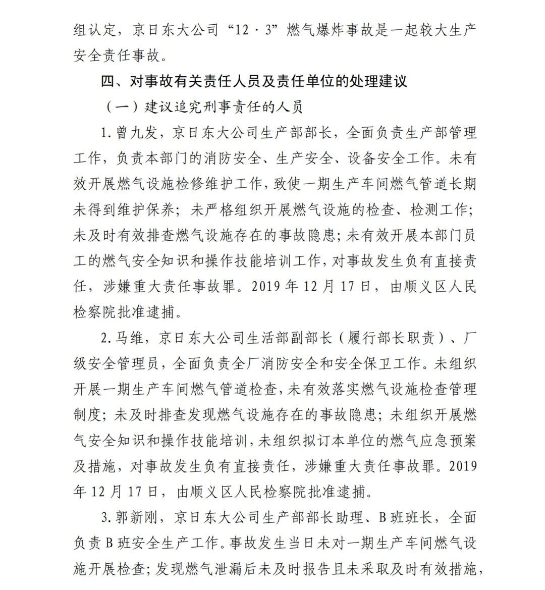 1.曾九發(fā),京日東大公司生產(chǎn)部部長(zhǎng),全面負(fù)責(zé)生產(chǎn)部管理工作,負(fù)責(zé)本部門(mén)的消防安全、生產(chǎn)安全、設(shè)備安全工作。未有效開(kāi)展燃?xì)庠O(shè)施檢修維護(hù)工作,致使一期生產(chǎn)車(chē)間燃?xì)夤艿篱L(zhǎng)期未得到維護(hù)保養(yǎng);未嚴(yán)格組織開(kāi)展燃?xì)庠O(shè)施的檢查、檢測(cè)工作;未及時(shí)有效排查燃?xì)庠O(shè)施存在的事故隱患;未有效開(kāi)展本部門(mén)員工的燃?xì)獍踩R(shí)和操作技能培訓(xùn)工作,對(duì)事故發(fā)生負(fù)有直接責(zé)任,涉嫌重大責(zé)任事故罪。2019 年 12 月 17 日,由順義區(qū)人民 檢察院批準(zhǔn)逮捕。