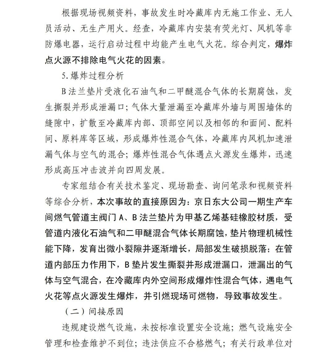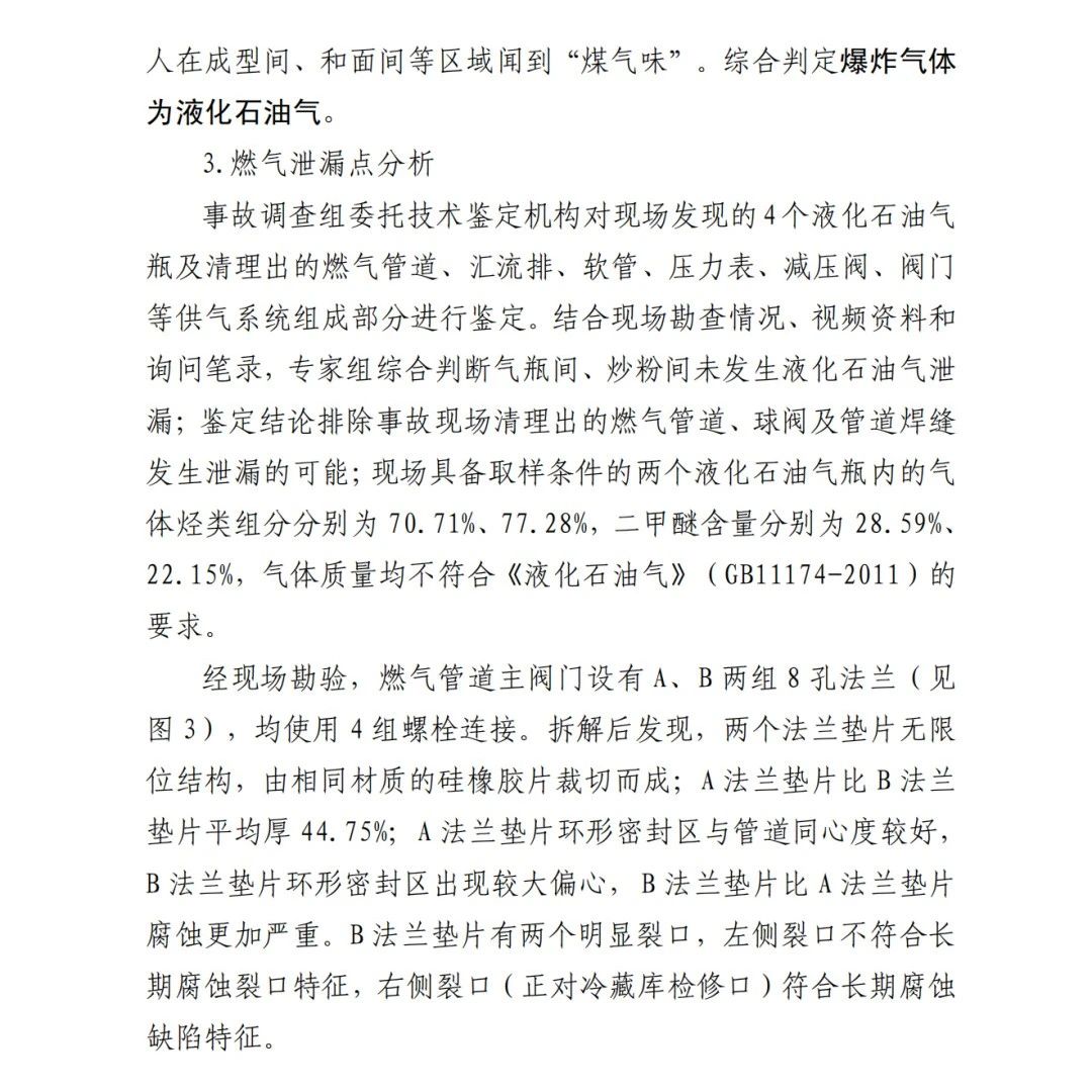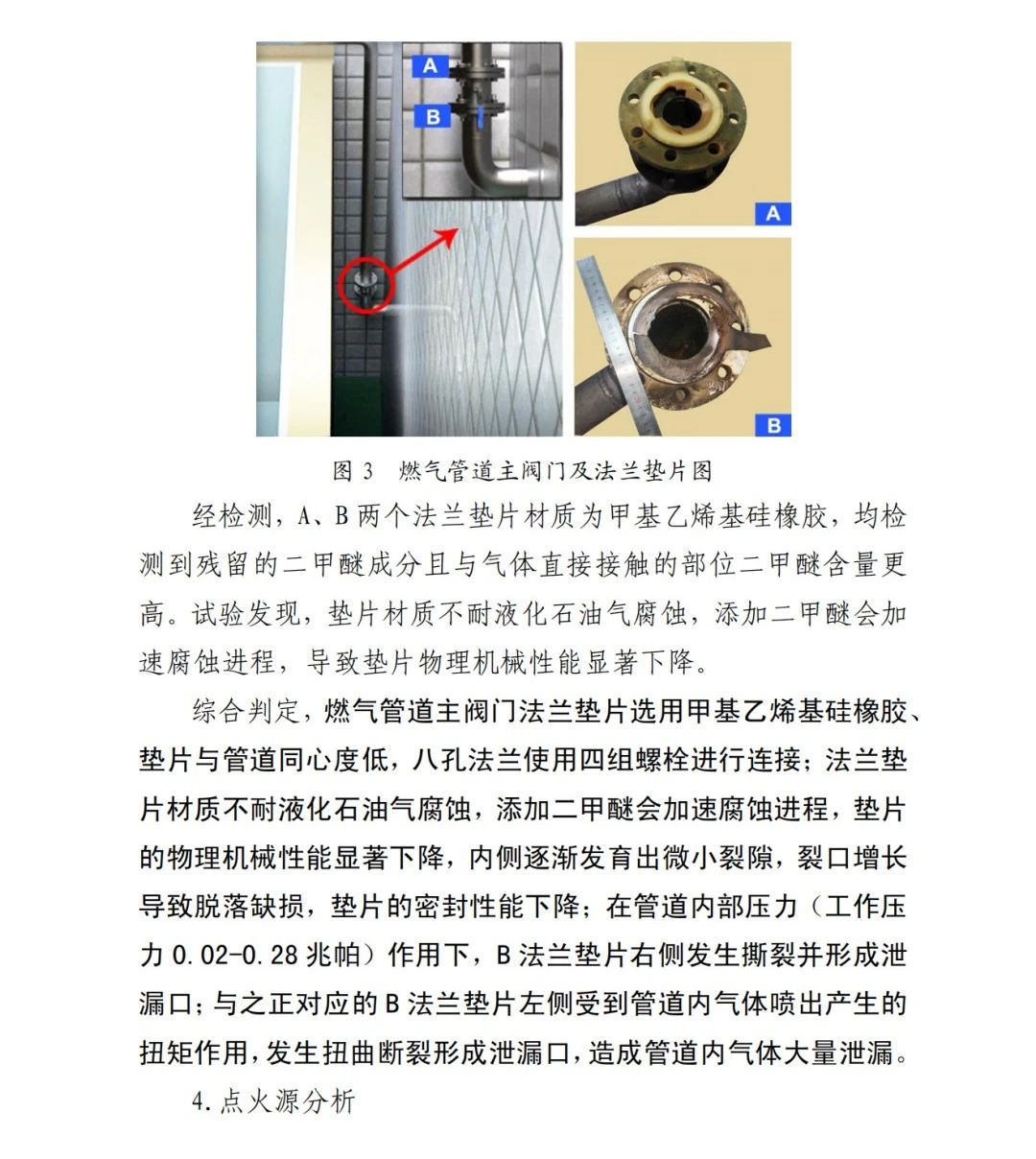 本次事故的直接原因?yàn)椋?/span>京日東大公司一期生產(chǎn)車(chē)間燃?xì)夤艿乐鏖y門(mén)A、B法蘭墊片為甲基乙烯基硅橡膠材質(zhì),受管道內(nèi)液化石油氣和二甲醚混合氣體長(zhǎng)期腐蝕,墊片物理機(jī)械性能下降,發(fā)育出微小裂隙并逐漸增長(zhǎng),局部發(fā)生破損脫落;在管道內(nèi)部壓力作用下,B墊片發(fā)生撕裂并形成泄漏口,泄漏出的氣體與空氣混合,在冷藏庫(kù)內(nèi)外空間形成爆炸性混合氣體,遇電氣火花等點(diǎn)火源發(fā)生爆炸,并引燃現(xiàn)場(chǎng)可燃物,導(dǎo)致事故發(fā)生。
