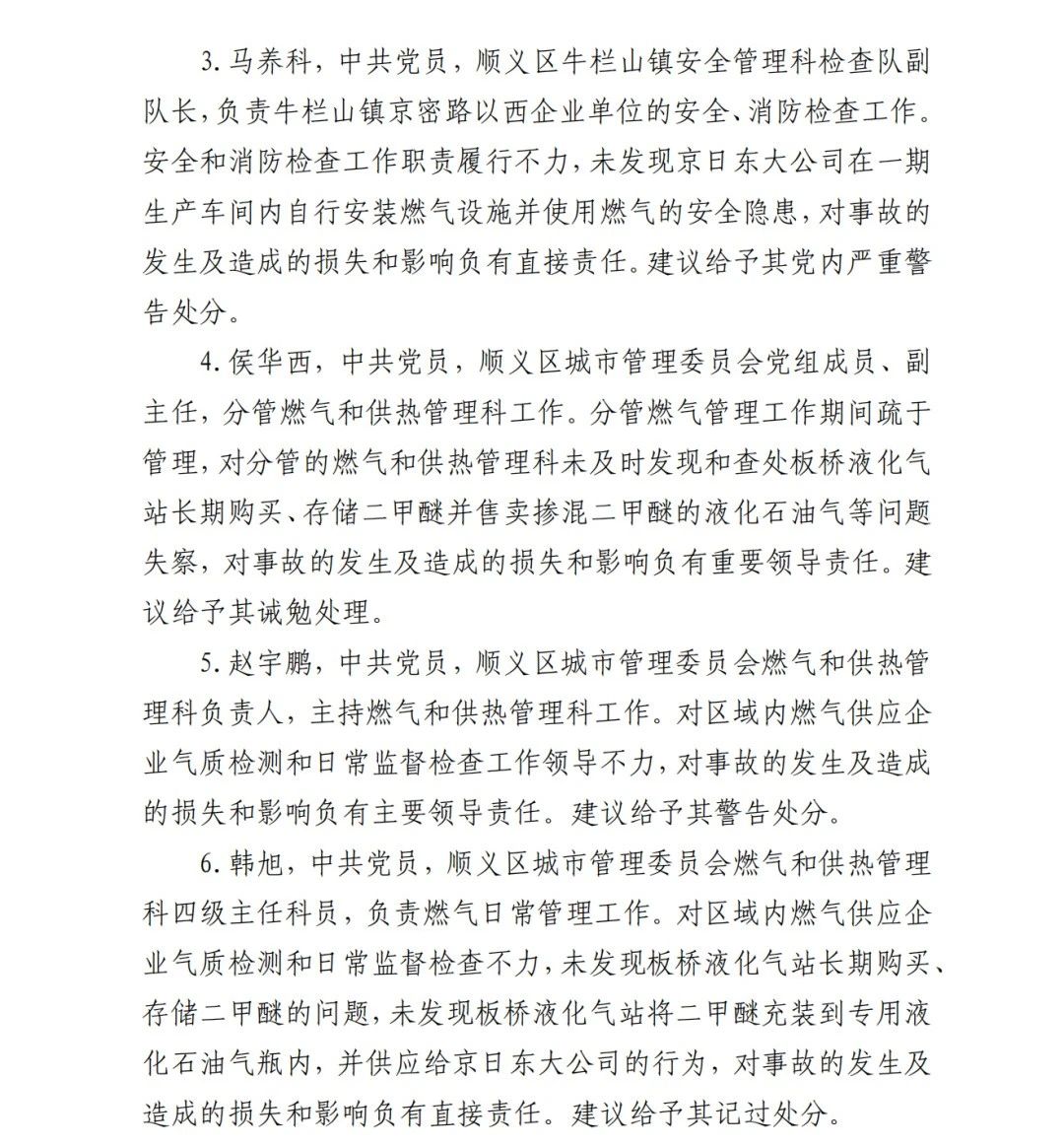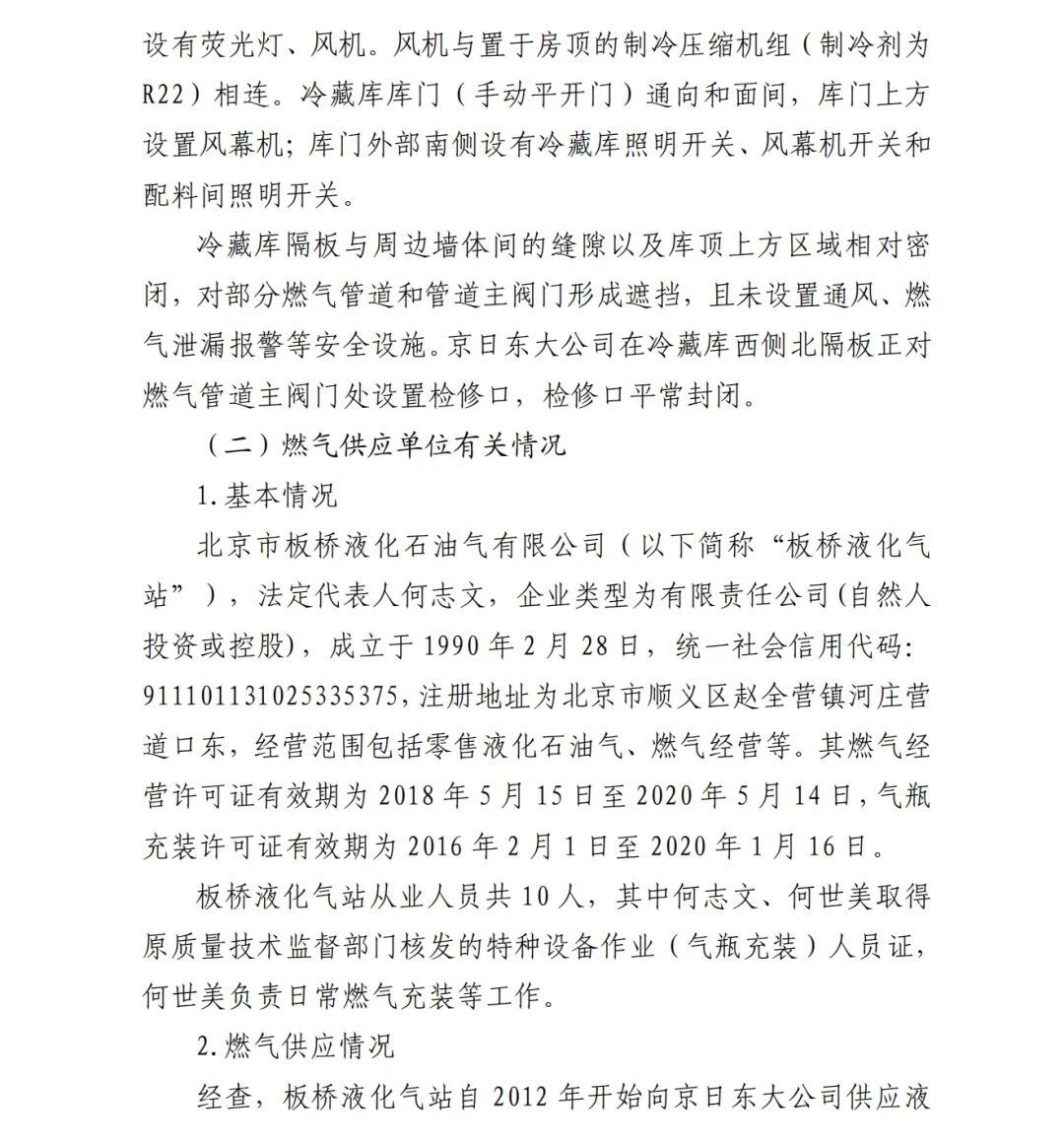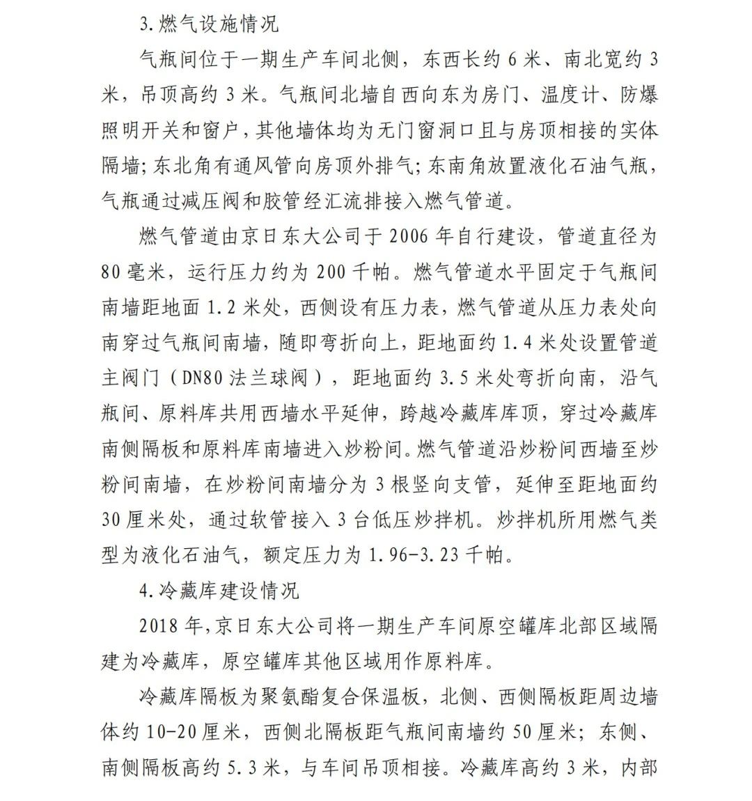 4.方勇忠,曾先后擔(dān)任京日東大公司生活部副部長(zhǎng)兼設(shè)備部部長(zhǎng)助理、設(shè)備部部長(zhǎng)、生產(chǎn)部部長(zhǎng)兼設(shè)備部部長(zhǎng)、總經(jīng)理助理2019年4月辭職)2006年負(fù)責(zé)京日東大公司一期生產(chǎn)車(chē)間建設(shè)工作,期間未委托具有相應(yīng)資質(zhì)的施工單位,組織本單位人員自行建設(shè)安裝燃?xì)庠O(shè)施,導(dǎo)致燃?xì)庠O(shè)施安全隱患長(zhǎng)期存在;2018 年負(fù)責(zé)一期生產(chǎn)車(chē)間內(nèi)新建冷藏庫(kù)建設(shè),將部分管道、閥門(mén)等燃?xì)庠O(shè)施封閉在通風(fēng)不良的場(chǎng)所內(nèi),且未設(shè)置通風(fēng)、燃?xì)庑孤﹫?bào)警等安全設(shè)施,對(duì)事故發(fā)生負(fù)有直接責(zé)任,涉嫌重大責(zé)任事 故罪。2020 年 1 月 23 日被順義公安分局刑事拘留,2 月 6 日取 保候?qū)?,建議依法追究刑事責(zé)任。