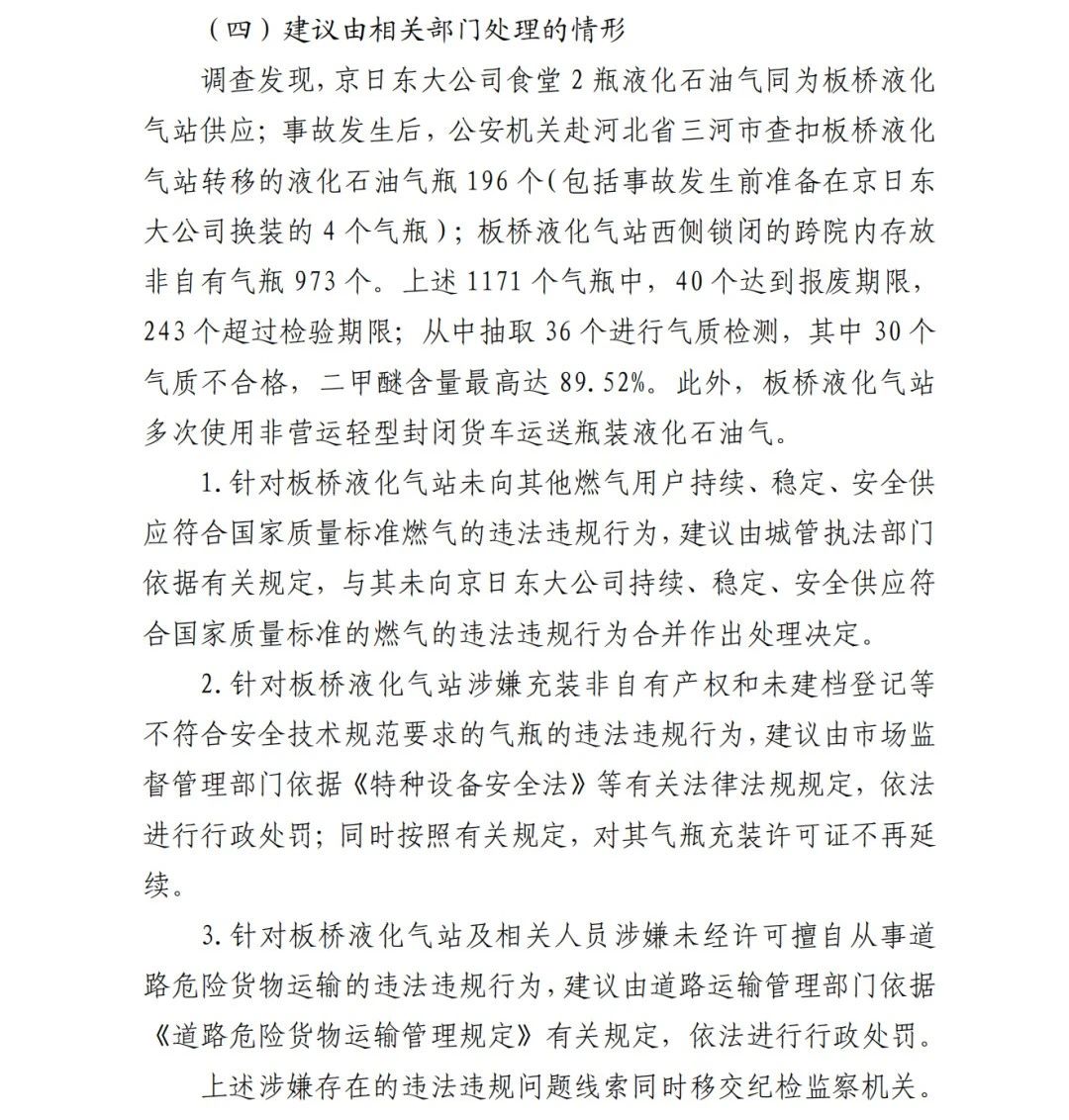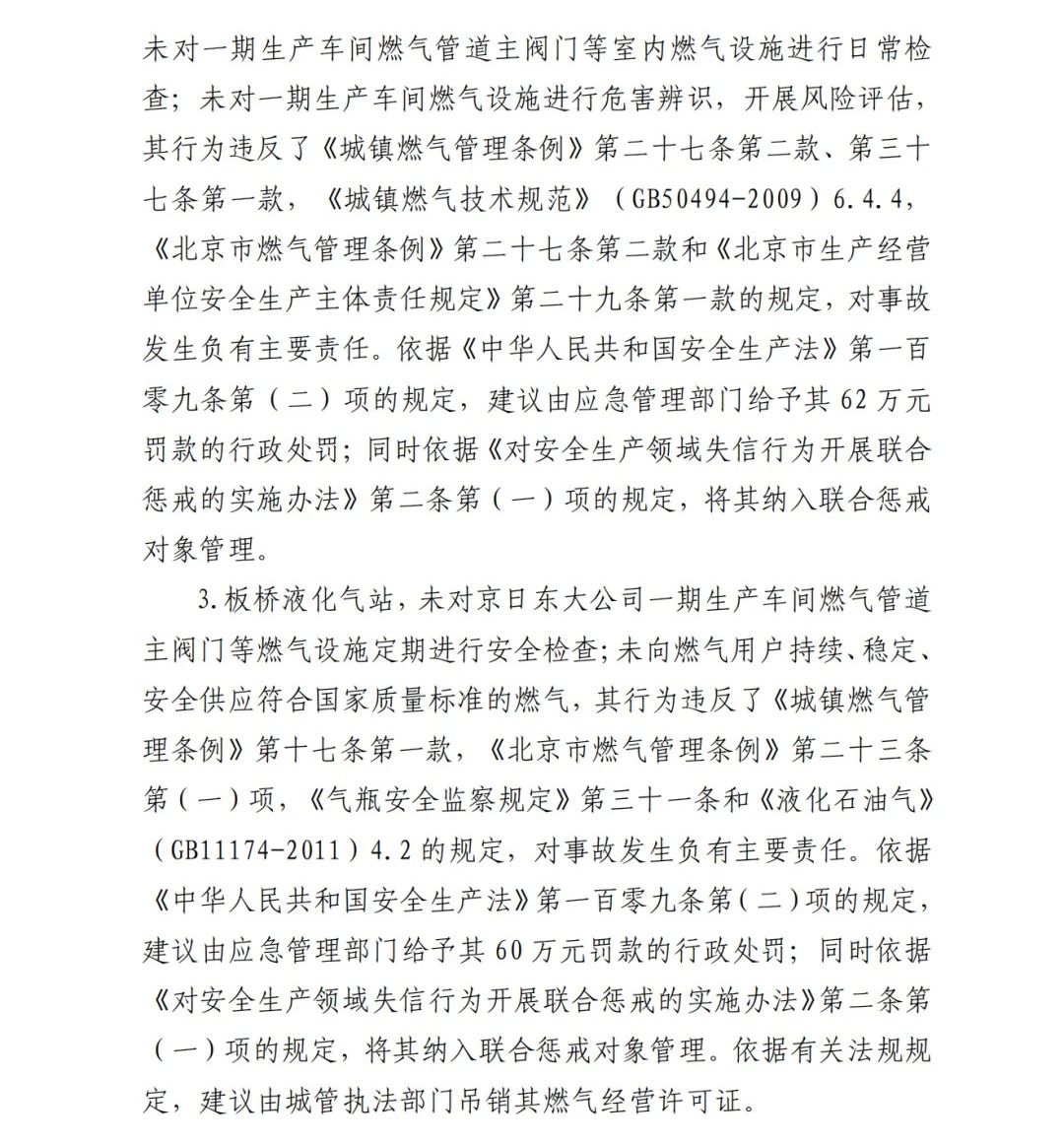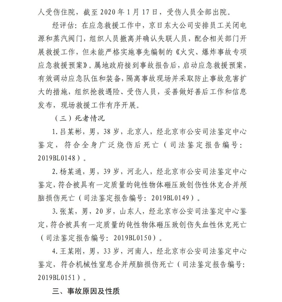 4.方勇忠,曾先后擔(dān)任京日東大公司生活部副部長(zhǎng)兼設(shè)備部部長(zhǎng)助理、設(shè)備部部長(zhǎng)、生產(chǎn)部部長(zhǎng)兼設(shè)備部部長(zhǎng)、總經(jīng)理助理2019年4月辭職)2006年負(fù)責(zé)京日東大公司一期生產(chǎn)車(chē)間建設(shè)工作,期間未委托具有相應(yīng)資質(zhì)的施工單位,組織本單位人員自行建設(shè)安裝燃?xì)庠O(shè)施,導(dǎo)致燃?xì)庠O(shè)施安全隱患長(zhǎng)期存在;2018 年負(fù)責(zé)一期生產(chǎn)車(chē)間內(nèi)新建冷藏庫(kù)建設(shè),將部分管道、閥門(mén)等燃?xì)庠O(shè)施封閉在通風(fēng)不良的場(chǎng)所內(nèi),且未設(shè)置通風(fēng)、燃?xì)庑孤﹫?bào)警等安全設(shè)施,對(duì)事故發(fā)生負(fù)有直接責(zé)任,涉嫌重大責(zé)任事 故罪。2020 年 1 月 23 日被順義公安分局刑事拘留,2 月 6 日取 保候?qū)?,建議依法追究刑事責(zé)任。