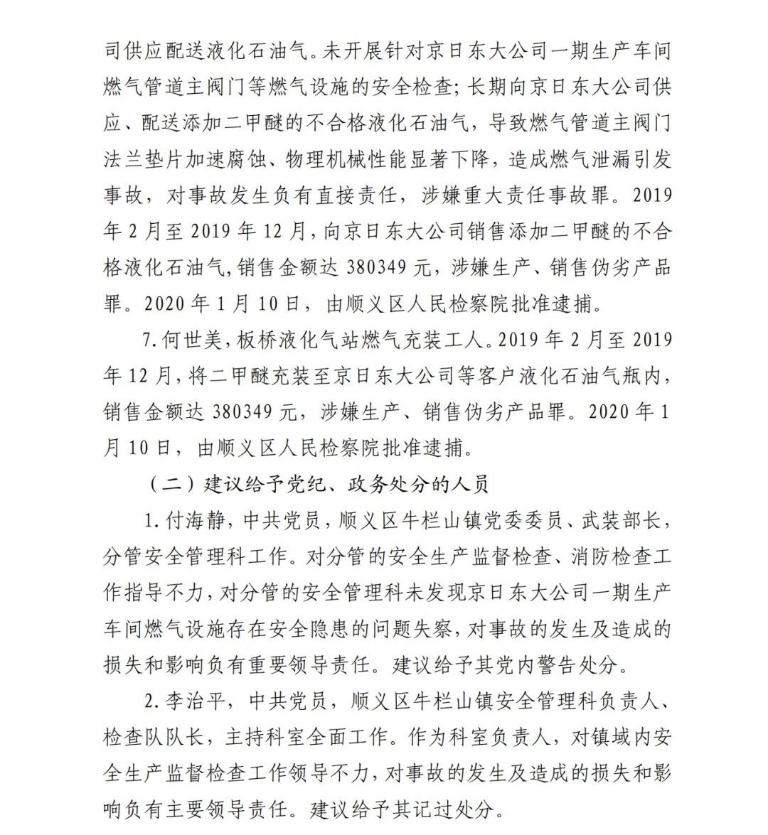 6.吳建新,板橋液化氣站工作人員,具體負(fù)責(zé)向京日東大公15司供應(yīng)配送液化石油氣。未開(kāi)展針對(duì)京日東大公司一期生產(chǎn)車(chē)間燃?xì)夤艿乐鏖y門(mén)等燃?xì)庠O(shè)施的安全檢查;長(zhǎng)期向京日東大公司供應(yīng)、配送添加二甲醚的不合格液化石油氣,導(dǎo)致燃?xì)夤艿乐鏖y門(mén)法蘭墊片加速腐蝕、物理機(jī)械性能顯著下降,造成燃?xì)庑孤┮l(fā) 事故,對(duì)事故發(fā)生負(fù)有直接責(zé)任,涉嫌重大責(zé)任事故罪。2019 年 2 月至 2019 年 12 月,向京日東大公司銷(xiāo)售添加二甲醚的不合 格液化石油氣,銷(xiāo)售金額達(dá) 380349 元,涉嫌生產(chǎn)、銷(xiāo)售偽劣產(chǎn)品 罪。2020 年 1 月 10 日,由順義區(qū)人民檢察院批準(zhǔn)逮捕。