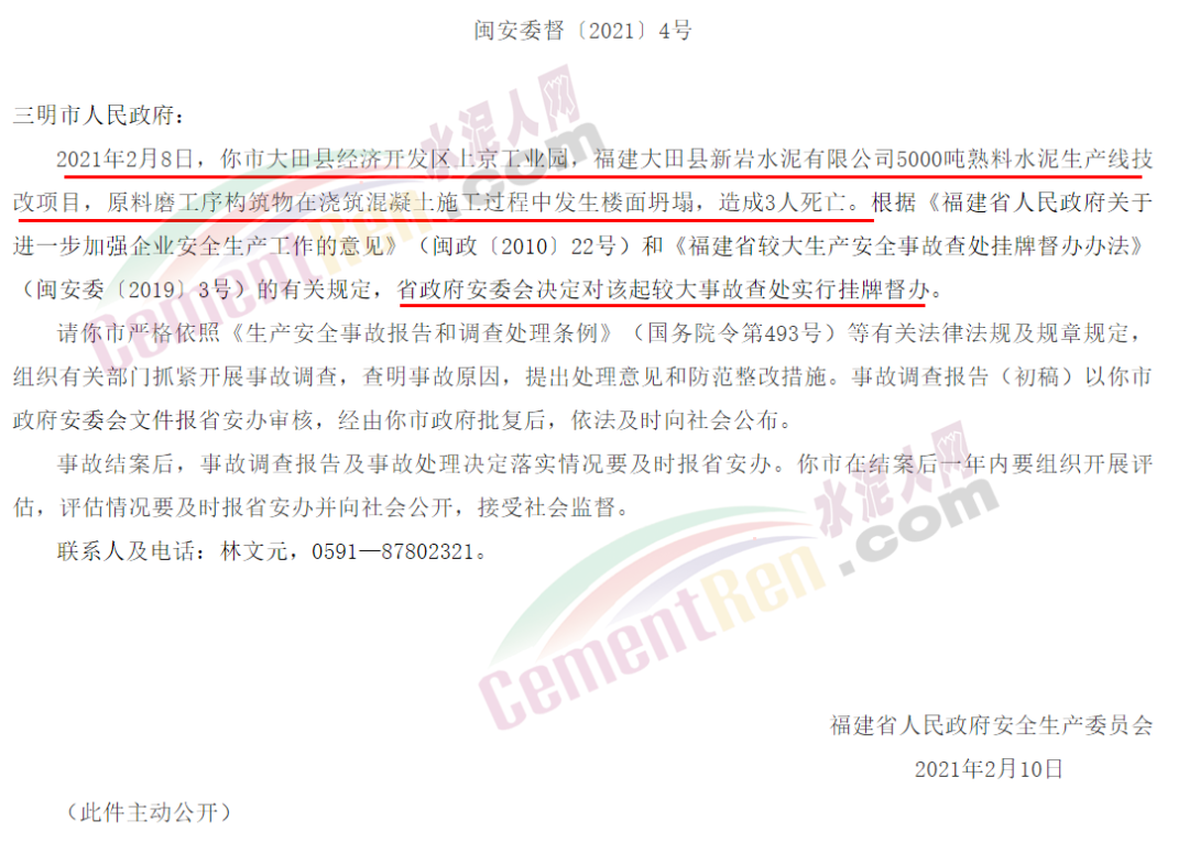 據(jù)水泥人網(wǎng)了解,福建省應(yīng)急管理廳發(fā)布較大生產(chǎn)安全事故查處掛牌督辦通知書(三明大田2.8水泥技改項目施工過程樓面坍塌事故)稱,2021年2月8日,三明市大田縣經(jīng)濟開發(fā)區(qū)上京工業(yè)園,福建大田縣新巖水泥有限公司5000噸熟料水泥生產(chǎn)線技改項目,原料磨工序構(gòu)筑物在澆筑混凝土施工過程中發(fā)生樓面坍塌,造成3人死亡。 依據(jù)有關(guān)規(guī)定,福建省政府安委會決定對該起較大事故查處實行掛牌督辦。