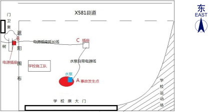 (2)水坑(A點(diǎn)即事故發(fā)生點(diǎn))旁邊有1臺(tái)220V的潛水泵(含水帶),規(guī)格及參數(shù)為:功率1.5kW,電壓220V,電流10A,重量15.8kg,自帶長(zhǎng)約7米的電源線;位于水坑北面約20米處有權(quán)屬于上橫中心小學(xué)的單相二線架空線路,末端出線引至距離水坑約10米處的樹上,再使用兩根塑料導(dǎo)線自裝臨時(shí)電源線和插座(B點(diǎn)),潛水泵與B點(diǎn)之間再通過一條不符合規(guī)范的電源插座延長(zhǎng)線(插座處為C點(diǎn))相連。AB兩點(diǎn)位置約10米(兩點(diǎn)之間有國(guó)華園林公司施工人員在清理碎石),AC兩點(diǎn)位置約4米,A、B、C三點(diǎn)呈一個(gè)三角形區(qū)域(見圖1)。當(dāng)天現(xiàn)場(chǎng)勘驗(yàn)和檢測(cè)發(fā)現(xiàn):潛水泵工作回路斷路,電源插頭零線端對(duì)外殼短路。電源插座處的L線與N線換位(安裝錯(cuò)誤)。事故現(xiàn)場(chǎng)還有薛柏林脫下的一雙全濕的襪子,未見個(gè)人勞動(dòng)防護(hù)用品。