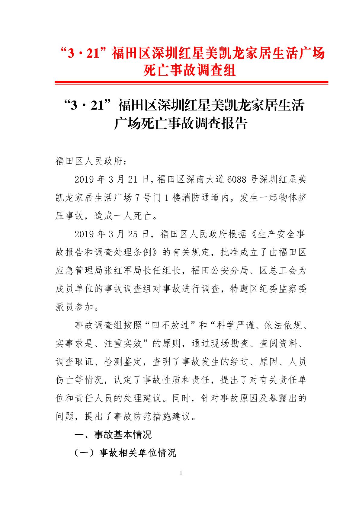 “3.21”福田區(qū)深圳紅心美凱龍家居生活廣場死亡事故調(diào)查報告