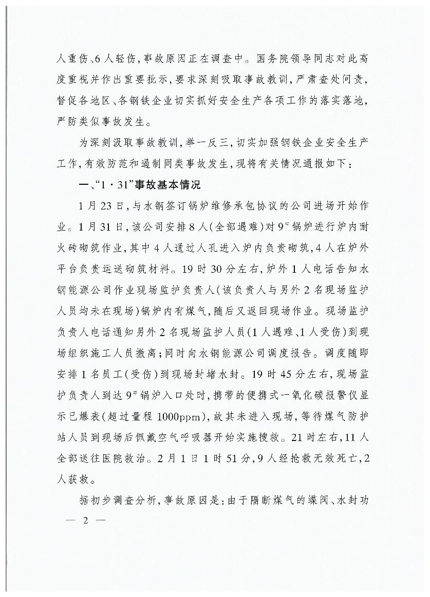 貴州首鋼水城鋼鐵(集團)有限責(zé)任公司“1?31”煤氣中毒等兩起較大事故的通報