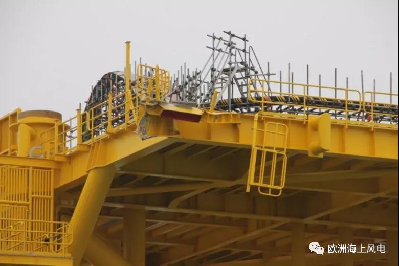照片顯示導(dǎo)管架外表有凹痕,平臺(tái)電纜橋面的一個(gè)角落損壞。