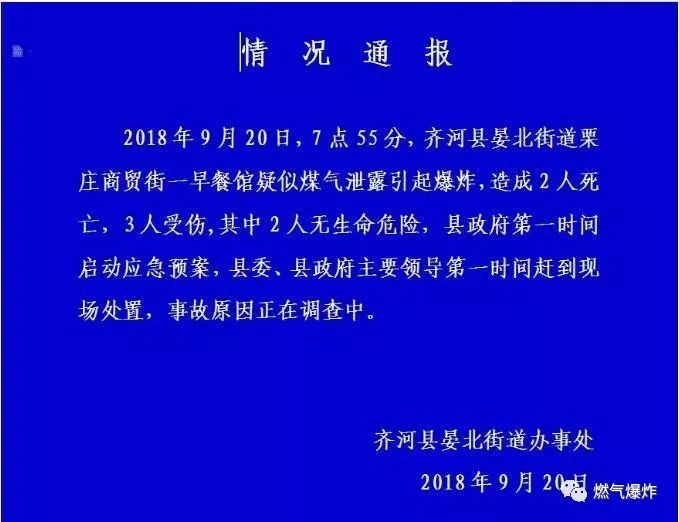 20日上午,10時(shí)左右,齊河縣晏北街道辦事處對外發(fā)布《情況通報(bào)》稱,2018年9月20日,齊河縣晏北街道栗莊商貿(mào)街一早餐館疑似煤氣泄漏引起爆炸,造成2人死亡,3人受傷,其中2人無生命危險(xiǎn),縣政府第一時(shí)間啟動應(yīng)急預(yù)案,縣委、縣政府主要領(lǐng)導(dǎo)第一時(shí)間趕到現(xiàn)場處置,事故原因正在調(diào)查中。