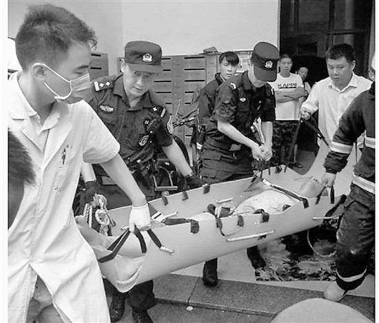 情況危急,消防隊(duì)員與PTU隊(duì)員合力將受傷男子抬上擔(dān)架,由120急救車送往醫(yī)院救治。