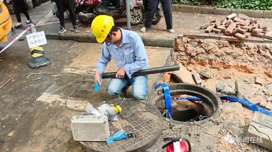 先不要敲,先不要敲,我們查一下濃度先,要不等一下(有)火花(發(fā)生)爆炸,這是雨水井啊,測(cè)一下濃度。這是雨水井,雨水井如果有氣進(jìn)去了同樣會(huì)爆炸,現(xiàn)在地下也是有,還是有是吧,等一下散了才能敲。
